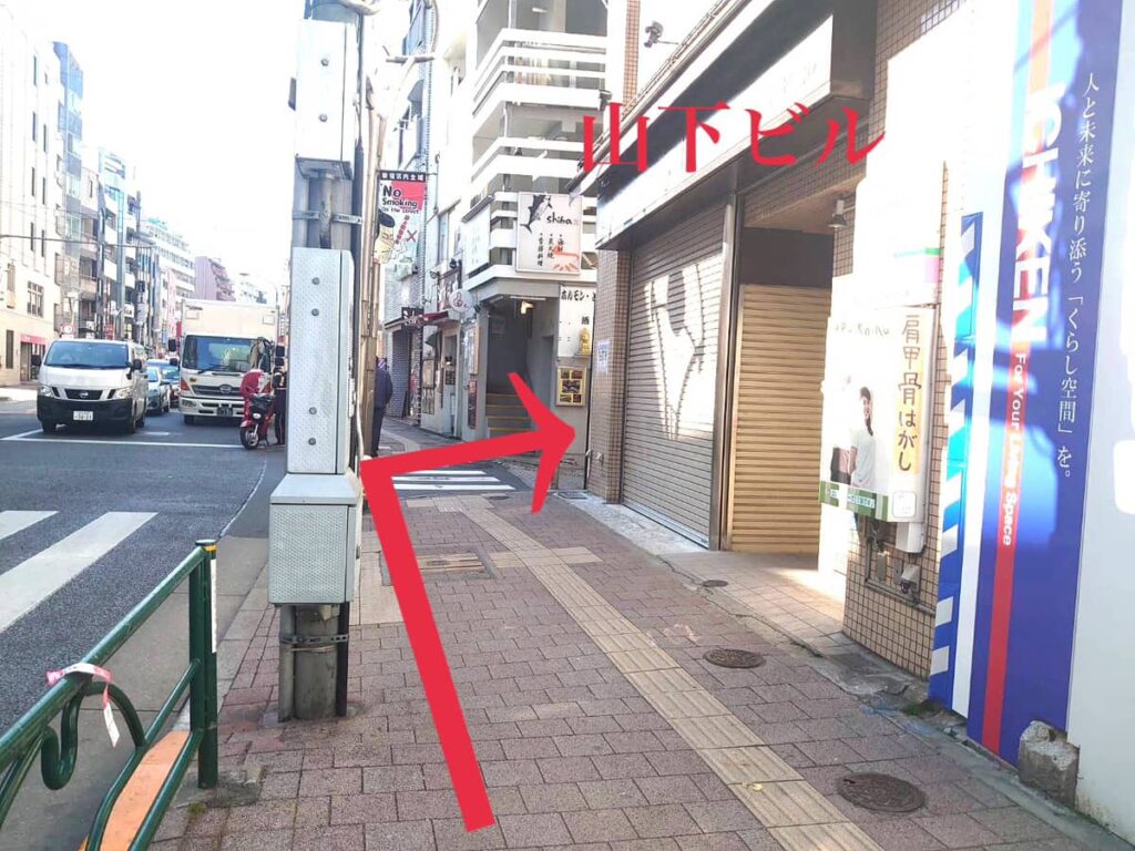 右手側に山下ビルが見えるので、その角を右に曲がります。