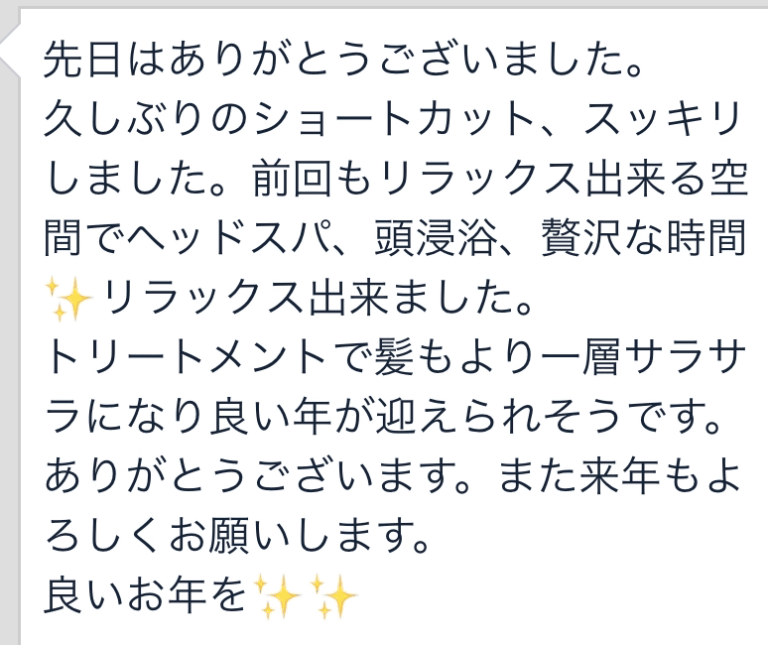 この度も綺麗に仕上げてくださりありがとうございました。スタイリストさんとは、前のサロンさんからお世話になっています。いつも私の扱いにくい髪質(硬い、癖毛、量多い)でも最善の方法を提案してくださり、私のリクエストに沿った施術を丁寧にしてくださいます。また、日々のヘアケアについても分かりやすく説明してくださるので、ズボラな私でも忘れずにケアをすることができています。